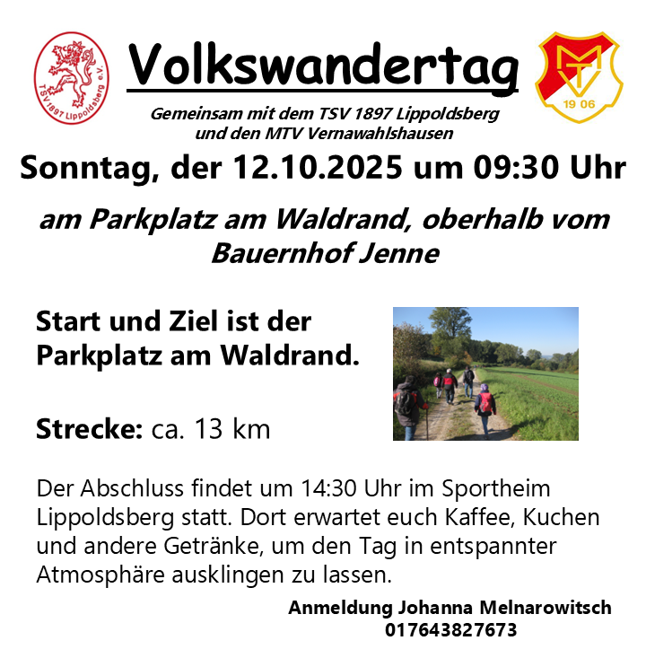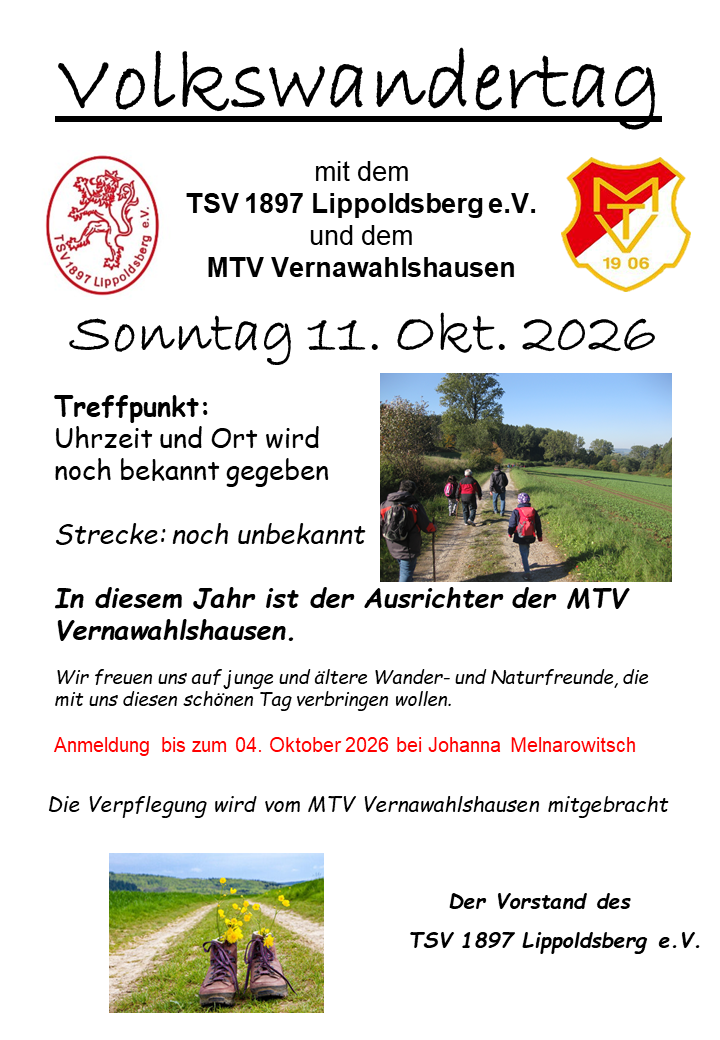 Jedes Jahr veranstaltet der TSV Lippoldsberg im jährlichen Wechsel mit dem MTV Vernawahlshausen im Monat Oktober ein Volkswandertag.
