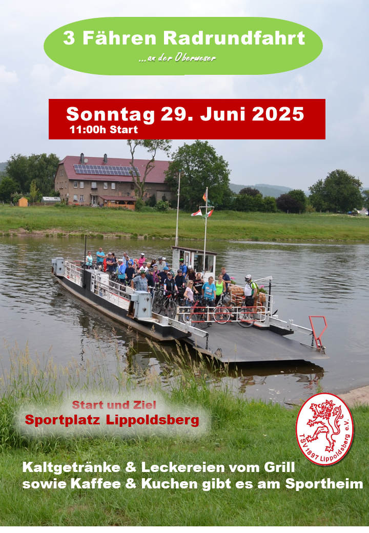 Lippoldsberg: Am Sonntag, den 29. Juni 2025 heißt es zum 31. Mal: „Rauf auf die Drahtesel und ab zu einer Radtour der ganz besonderen Art“. Es ist ein sportliches Programm für jedes Alter. Hierbei wird die Weser viermal über drei Gierseilfähren der Ortschaften Oedelsheim, Lippoldsberg und Wahmbeck übergesetzt. Die Gesamtstrecke umfasst eine Länge von 23 Km gut ausgebaute und asphaltierter Radwege.