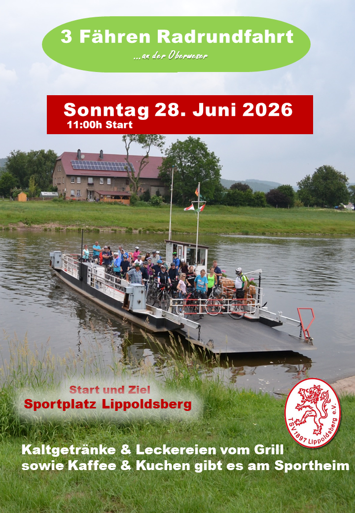 Lippoldsberg: Am Sonntag, den 28. Juni 2026 heißt es zum 32. Mal: „Rauf auf die Drahtesel und ab zu einer Radtour der ganz besonderen Art“. Es ist ein sportliches Programm für jedes Alter. Hierbei wird die Weser viermal über drei Gierseilfähren der Ortschaften Oedelsheim, Lippoldsberg und Wahmbeck übergesetzt. Die Gesamtstrecke umfasst eine Länge von 23 Km gut ausgebaute und asphaltierter Radwege.